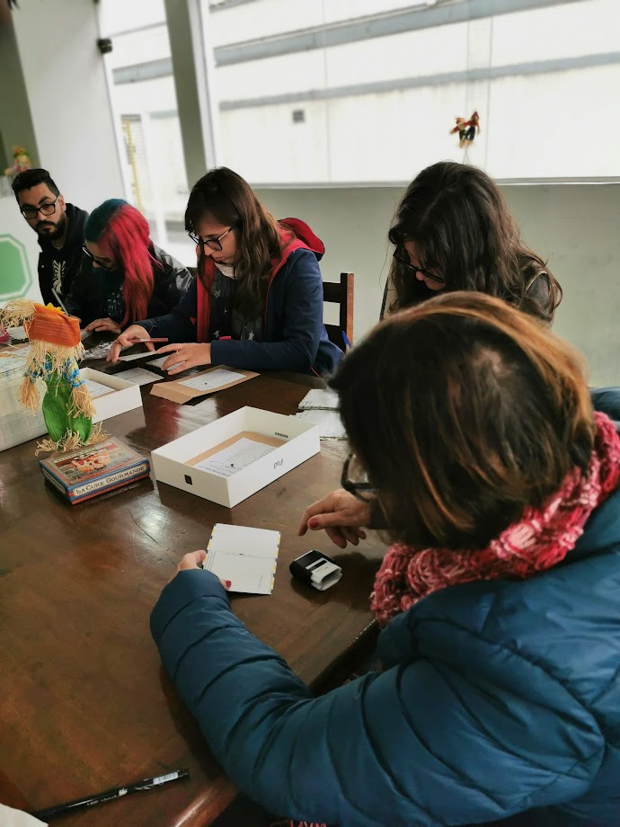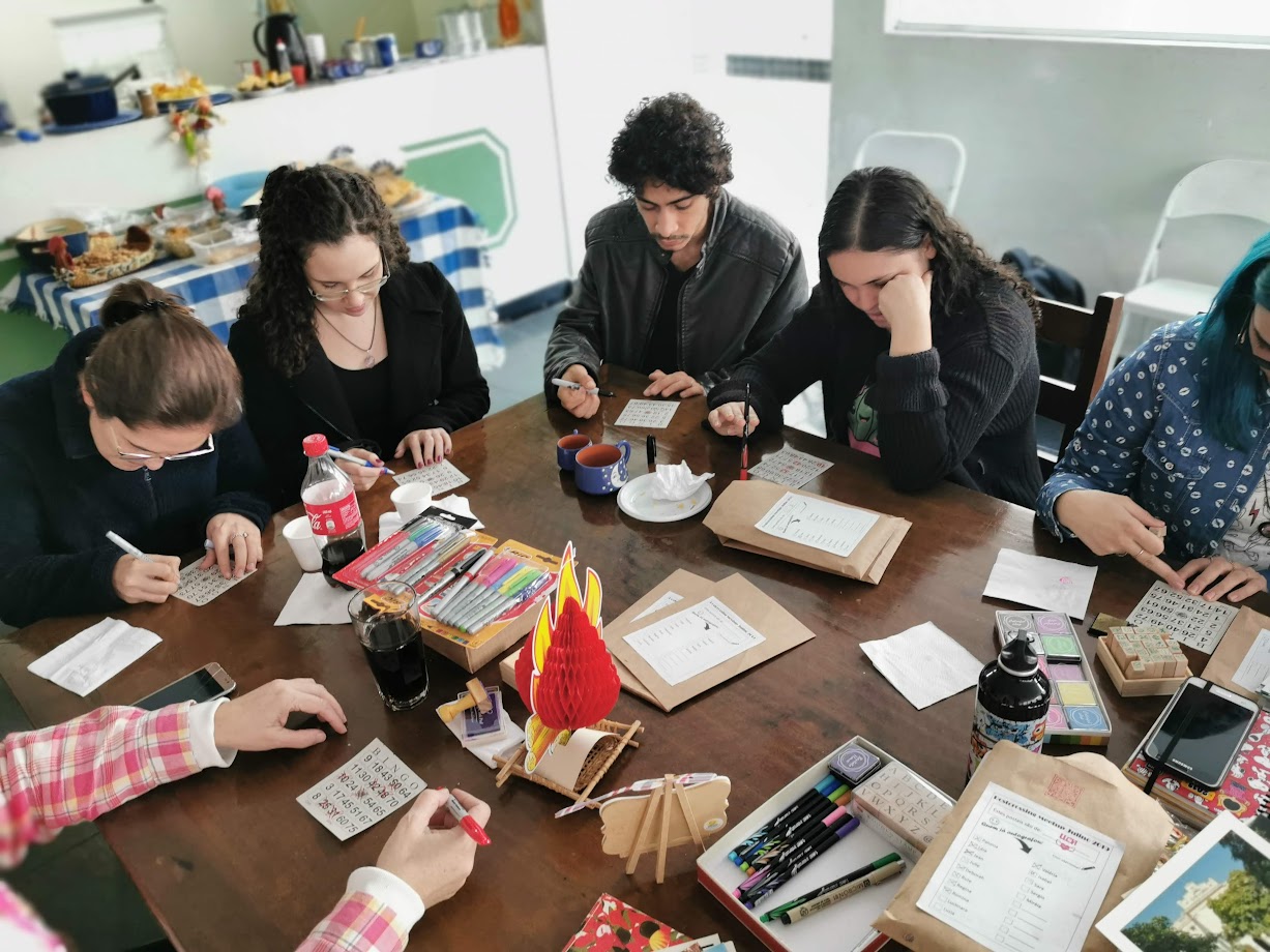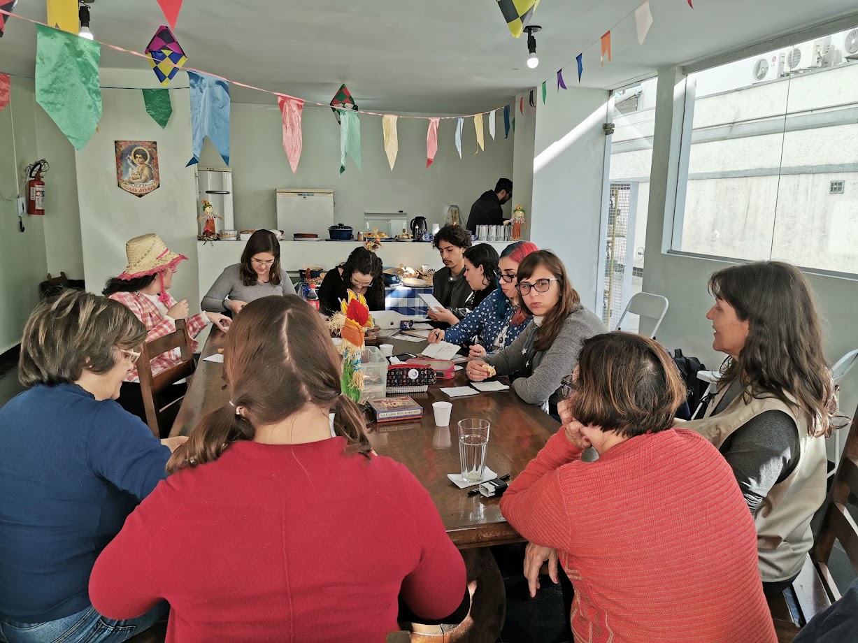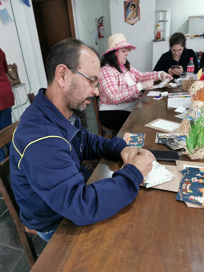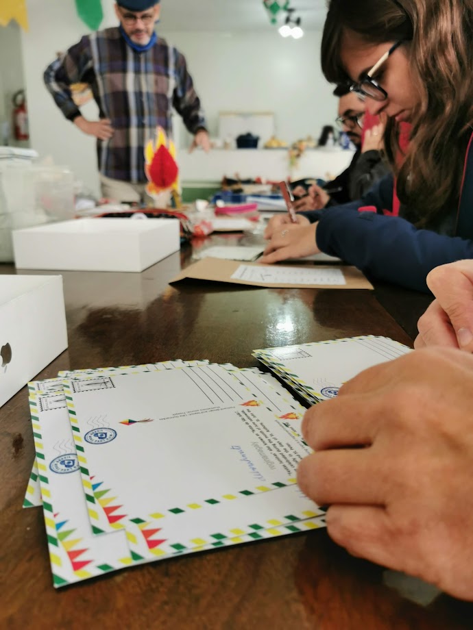 Claro que nós precisamos ganhar forças para assinar as pilhas de postais. E comida típica não faltou. Todos colaboraram, de vinho quente a bolo de fubá.